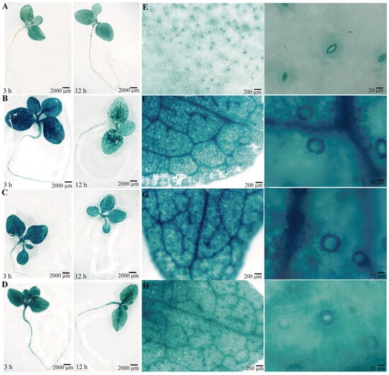 GUS histochemical staining for the PsPIP2-4 promoter after 6% PEG6000, 100 mM NaCl, and 100 µM MeJA stress treatments in transgenic tobacco seedlings. GUS staining for the whole transgenic plants under normal (A), 6% PEG (B), 100 mM NaCl (C), and 100 µM MeJA (D) stress conditions for 3 h and 12 h. GUS staining for the transgenic leaves and their guard cells under normal (E), 6% PEG (F), 100 mM NaCl (G), and 100 µM MeJA (H) stress conditions for 3 h.