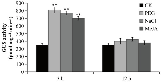 GUS activities of the PsPIP2-4 promoter after 6% PEG6000, 100 mM NaCl, and 100 µM MeJA stress treatments in the whole transgenic tobacco seedlings. GUS activities of seedlings without stress treatments at the same time points under the same environmental conditions are used as a control (CK). ** represents means of nine replicates (n = 9) that are significantly different at the p < 0.01 level (t-test).