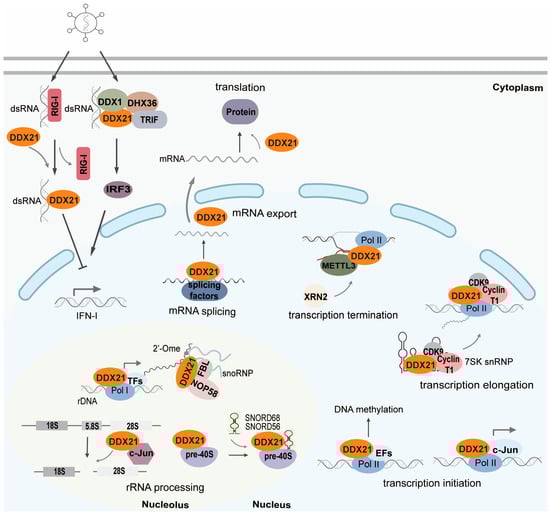 DDX21 is involved in the regulation of gene transcription at every stage, ranging from the precise initiation to efficient RNA synthesis during elongation and proper pausing during termination [24,32,33]. It coordinates with RNA polymerase, transcription factors, and other regulatory proteins to ensure the spatiotemporal specificity of gene expression.