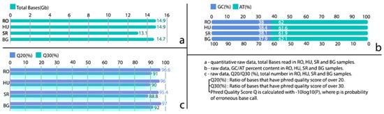 NGS raw-data statistics for all four locations (RO, HU, SR, and BG). (a) quantitative raw data, total bases read in RO, HU, SR and BG samples; (b) raw data, GC/AT percent content in RO, HU, SR and BG samples; (c) raw data, Q20/Q30(%) total number in RO, HU, SR and BG samples.