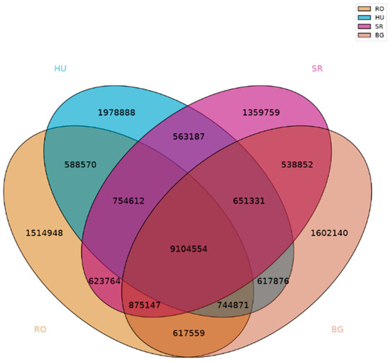 For SNP comparison in all four datasets (RO, HU, SR, and BG), a Venn diagram was generated for visualization (Figure 2). Sets of Venn diagrams were generated for paired locations, such as HU-BG, HU-SR, RO-BG, RO-HU, RO-SR, and SR-BG. For more details, see the Supplementary Material Figures S1–S6.