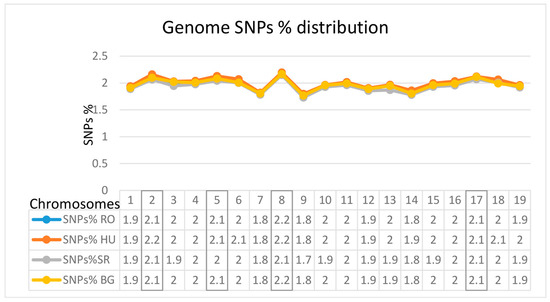 The chromosomal SNP-percentage-level representations with highest values at all four locations (RO, HU, SR, and BG).