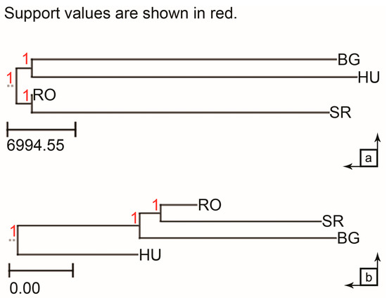 The Minigraph–Cactus pipeline [69] implemented in the Cactus software package, v. 2.5.1, was used to create a multiple genome alignment of the 4 primary assemblies with masked repeats. The resulting HAL assembly was then used to infer 2 phylogenetic trees: the first one was created using Ragout v. 2.3 [70] and based on breakpoint distances (e.g., from inversions, translocations, or other chromosomal rearrangements, as depicted in Figure 4a), while the second tree was based on substitution distances (i.e., numbers of SNPs, as shown in Figure 4b) and inferred via the phyloFit method from the PHAST package [71]. The value “1,000,100” was used for the synteny block size in Ragout, while the phylogenetic tree structure “((BG, HU),(RO,SR));” was used for PHAST. The latter choice was based on the results of the Venn diagrams from the nf-core/Sarek analyses, as outlined in the Results section.