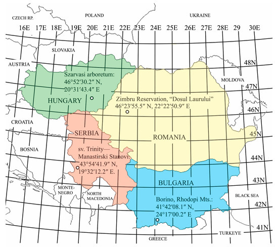 Harvesting points of Ilex aquifolium L. samples. Romania, Zimbru Reservation, “Dosul Laurului”, GPS coordinates of 46°23′55.5″ N, 22°22′50.9″ E; Hungary, Szarvasi Arboretum, 46°52′30.2″ N, 20°31′43.4″ E; Bulgaria, Borino, Rhodope Mountains, 41°42′08.1″ N, 24°17′00.2″ E; and Serbia, in the middle of the Mala Reka region, Sv. Trinity—Manastirski Stanovi, 43°54′41.9″ N, 19°32′12.2″ E.