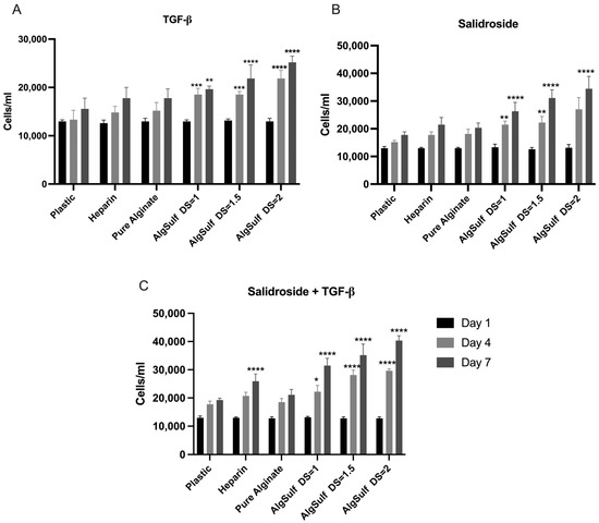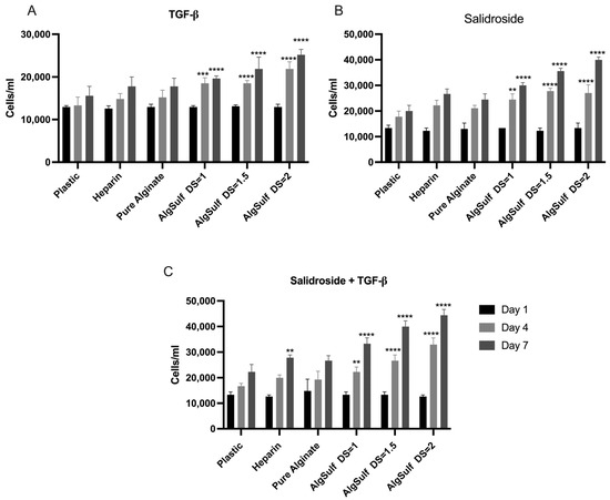 Proliferation assay for P2 chondrocytes subjected to TGF-β only (A), Salidroside only (B), and Salidroside and TGF-β (C). (A) In the presence of TGF-β only in the media, the cells cultured on Alginate Sulfate with a DS = 2 displayed the highest increase in chondrocyte numbers during the experiment, demonstrating that a higher DS offers the most suitable medium for cell growth on both day 4 and day 7. (B) The cells cultured in the presence of Salidroside only on Alginate Sulfate with a DS = 2 illustrated a higher proliferation rate on days 4 and 7 compared to the negative control (on plastic). (C) The presence of both TGF-β and Salidroside in the media displayed a significantly higher proliferation rate on days 4 and 7. Data are presented as mean ± SD. Statistical analysis was performed using two-way ANOVA and post hoc Tukey’s tests. Statistical significances are denoted as ** = p < 0.01; *** = p < 0.001; **** = p < 0.0001; n = 3.