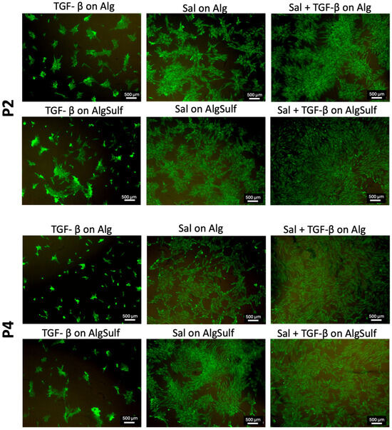 The Live/Dead assay performed on both P2 and P4 chondrocytes showed that the highest cell viability occurred in the presence of Salidroside and TGF-β when cells were grown on Alginate Sulfate (DS = 2.0). In addition, in the presence of Salidroside, alone or when combined with TGF-β, the chondrocytes exhibited a round morphology, typical of healthy chondrocytes, showing that Salidroside alone can maintain cell viability and the chondrogenic phenotype efficiently. Conversely, when the chondrocytes were subjected to TGF-β on Pure Alginate, the cell density was lower compared to conditions containing Salidroside, and the chondrocytes displayed fibroblastic morphology, signaling a shift toward dedifferentiation. This observation aligns with previous experiments, which revealed Salidroside’s ability to maintain the chondrocyte phenotype and protect morphology during passaging, thereby preventing dedifferentiation [16].