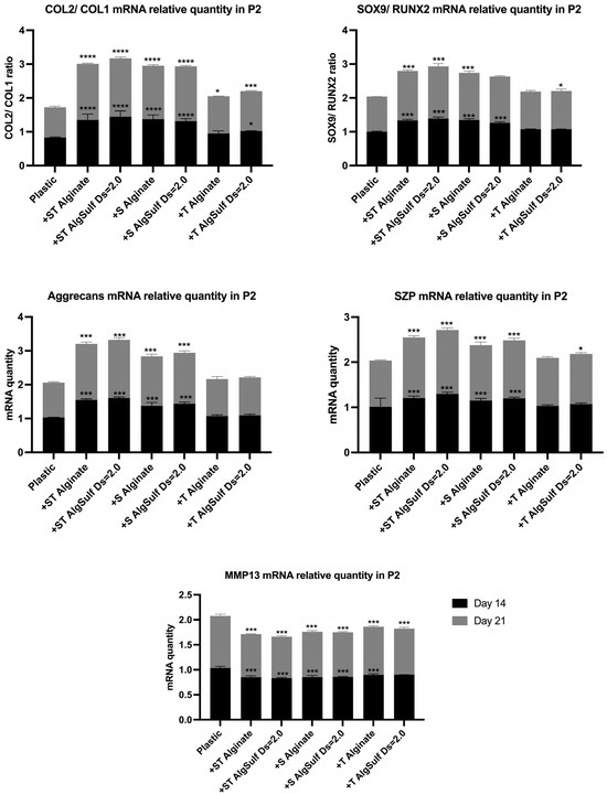 Col2/Col1, SOX9/RUNX2, Aggrecan, SZP, and MMP13 mRNA relative quantity in P2 chondrocytes. Cells were cultured on plastic (negative control), on Pure Alginate in the presence of Salidroside and TGF-β (+ST Pure Alginate), on Alginate Sulfate of DS = 2 in the presence of Salidroside and TGF-β (+ST Alginate Sulfate DS = 2.0), on Pure Alginate in the presence of Salidroside only (+S Pure Alginate), on Alginate Sulfate of DS 2 in the presence of Salidroside only (+S Alginate Sulfate DS = 2.0), on Pure Alginate in the presence of TGF-β only (+T Pure Alginate), and on Alginate Sulfate of DS 2 in the presence of TGF-β only (+T Alginate Sulfate DS = 2.0), on days 14 and 21. (The combination of Salidroside and TGF-β, with Alginate Sulfate of DS = 2.0, led to the highest Col2/Col1 ratio, SOX9/RUNX2 ratio, and SZP and Aggrecan mRNA levels, suggesting the best condition to prevent chondrogenic dedifferentiation. In the presence of Salidroside alone, or combined with TGF-β, MMP13 mRNA levels were significantly reduced, especially on alginate sulfate.) Results are shown as a ratio to negative control. Data are presented as mean ± SD. Statistical analysis was performed using two-way ANOVA and post hoc Tukey’s tests. Statistical significances are denoted as * = p < 0.05; *** = p < 0.001; **** = p < 0.0001; n = 3.