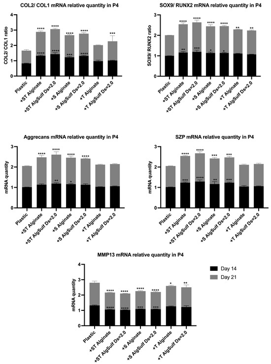 Col2/Col1, SOX9/RUNX2, Aggrecan, SZP, and MMP13 mRNA relative quantity in P4 chondrocytes. Cells were cultured on plastic (negative control), on Pure Alginate in the presence of Salidroside and TGF-β (+ST Pure Alginate), on Alginate Sulfate of DS 2 in the presence of Salidroside and TGF-β (+ST Alginate Sulfate DS = 2.0), on Pure Alginate in the presence of Salidroside only (+S Pure Alginate), on Alginate Sulfate of DS = 2 in the presence of Salidroside only (S Alginate Sulfate D = 2.0), on Pure Alginate in the presence of TGF-β only (+T Pure Alginate), and on Alginate Sulfate of DS = 2.0 in the presence of TGF-β only (+T Alginate Sulfate DS = 2.0), on days 14 and 21. (The combination of Salidroside and TGF-β, with Alginate Sulfate DS = 2.0, resulted in the highest Col2/Col1 ratio, SOX9/RUNX2 ratio, SZP, and Aggrecan mRNA levels. highlighting the role of this treatment in providing a suitable chondrogenic environment for P4 chondrocytes. This treatment was also the best at downgrading the levels of MMP13 mRNA levels, especially when P4 was grown on alginate sulfate.) Results are shown as a ratio to negative control. Data are presented as mean ± SD. Statistical analysis was performed using two-way ANOVA and post hoc Tukey’s tests. Statistical significances are denoted as * = p < 0.05; ** = p < 0.01; *** = p < 0.001; **** = p < 0.0001; n = 3.