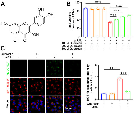 Quercetin restores cell viability and suppresses ROS generation in atRAL-treated 661W cells. (A) Structure of quercetin. (B) Cell viability (n = 6). (C) Fluorescence imaging of ROS and ER (n = 3). Scale bars, 10 μm. *** p < 0.001.