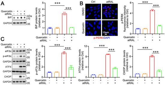 Effect of quercetin on the PERK/eIF2α/ATF4/CHOP signaling in atRAL-loaded cells. (A) Immunoblotting analysis and quantification of BiP (n = 3). (B) Immunofluorescence analysis and quantification of p-PERK (n = 3). Scale bars, 10 μm. (C) Immunoblotting analysis of eIF2α, p-eIF2α, ATF4, and CHOP, and quantification of p-eIF2α, ATF4, and CHOP (n = 3). *** p < 0.001.