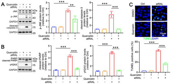 Effect of quercetin on atRAL-induced apoptosis in 661W cells. (A) Immunoblotting analysis of JNK, p-JNK, and cleaved caspase-3, and quantification of p-JNK and cleaved caspase-3 (n = 3). (B) Immunoblotting analysis of PARP, cleaved PARP, and γH2AX, and quantification of cleaved PARP and γH2AX (n = 3). (C) TUNEL staining (n = 3). Scale bars, 10 μm. ** p < 0.01 and *** p < 0.001.