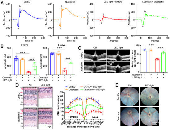 Given the protective effect of quercetin on photoreceptor cells against atRAL in vitro, we assessed its impact on light-induced retinal damage in Abca4−/−Rdh8−/− mice. Previous studies have shown that Abca4−/−Rdh8−/− mice develop obvious retinal degeneration after exposure to bright light compared with normal C57BL/6J mice [7]. Retinal function was evaluated using full-field ERG. It was found that quercetin dramatically prevented the decline in the amplitudes of both a-waves and b-waves in light-exposed Abca4−/−Rdh8−/− mice (Figure 4A,B). Photoreceptor atrophy was analyzed through OCT imaging and H&E staining. The results demonstrated that quercetin significantly restored the thickness of the total retinal layer and the outer nuclear layer (ONL) of Abca4−/−Rdh8−/− mice in response to light exposure (Figure 4C,D). Additionally, fundus imaging indicated that quercetin clearly alleviated light-induced punctate lesions in the retina of Abca4−/−Rdh8−/− mice (Figure 4E). Collectively, these findings suggest that quercetin treatment effectively mitigates both structural and functional damage to the retina induced by light in Abca4−/−Rdh8−/− mice.