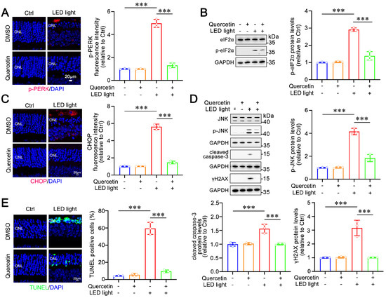 Our previous study has demonstrated that light exposure activates the PERK/eIF2α/ATF4/CHOP signaling pathway in the neural retina of Abca4−/−Rdh8−/− mice, as compared to C57BL/6J mice [26]. In this study, we investigated the effect of quercetin on this axis in the neural retina of Abca4−/−Rdh8−/− mice upon exposure to light. Immunofluorescence analysis of retinal tissue sections revealed that quercetin significantly reduced protein levels of p-PERK in photoreceptors of light-exposed Abca4−/−Rdh8−/− mice (Figure 5A). Immunoblotting analysis of neural retina extracts showed that quercetin remarkably attenuated p-eIF2α protein levels in Abca4−/−Rdh8−/− mice with light exposure (Figure 5B). Moreover, quercetin markedly inhibited CHOP activation and reduced protein levels of p-JNK, cleaved caspase-3, and γH2AX in the neural retina of Abca4−/−Rdh8−/− mice after exposure to light (Figure 5C,D). The results of TUNEL staining showed a substantial decrease in the number of apoptotic cells in the photoreceptor ONL from quercetin-treated Abca4−/−Rdh8−/− mice with light illumination (Figure 5E). These findings imply that quercetin mitigates light-induced photoreceptor apoptosis in Abca4−/−Rdh8−/− mice via repressing the activation of the PERK/eIF2α/ATF4/CHOP signaling pathway.