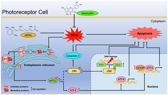 Considered collectively, this study elucidates the protective effect of quercetin on the retina characterized by the atRAL overload and its underlying mechanisms. As depicted in Figure 6, in atRAL-exposed photoreceptor cells, quercetin preserves ER homeostasis by reducing ROS generation, thereby inhibiting photoreceptor apoptosis through modulation of the ER stress-induced PERK/eIF2α/ATF4/CHOP signaling pathway. These findings suggest that quercetin may serve as a potential therapeutic agent for atRAL-associated retinopathies.