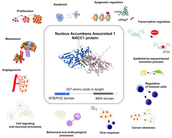 Function of nucleus accumbens associated protein 1 (NACC1) in biological processes. The protein and the NACC1 gene transcript itself play an important role in non-neoplastic processes (cell signaling and neuronal processes, regulation of behavioral and embryological processes, as well as with cellular response to viral infection), but mainly it is closely related to the neoplastic process. In the case of cancers, NACC1 is associated with the regulation of cellular processes (proliferation, angiogenesis, metastasis, apoptosis, as well as regulation of immune cells), epigenetic regulation (regulation of histone, and influence on lncRNA and miRNA), transcription regulation, and regulation of cell phenotype through processes such as epithelial–mesenchymal transition and regulation of cancer stemness. Structure of NACC1 protein was taken from https://www.ebi.ac.uk/pdbe/pdbe-kb/proteins/Q96RE7 (accessed on 10 December 2024) [7,15,27,28,29,30].