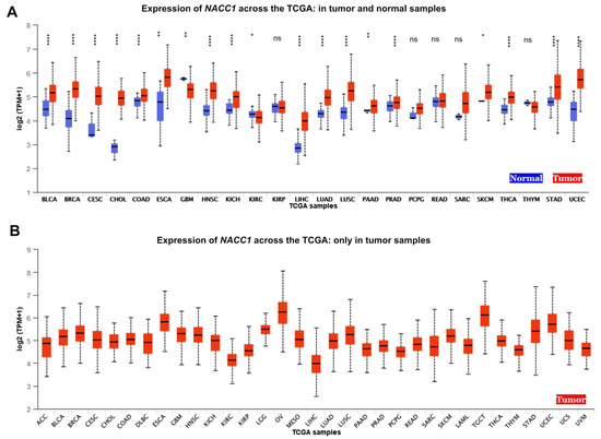 Expression of NACC1 across TCGA cancers (with tumor (red) and normal (blue) samples). (A) Expression of NACC1 across the TCGA: in tumor and normal samples. (B) Expression of NACC1 across the TCGA: only in tumor samples. Figure taken from the UALCAN database. BLCA, bladder urothelial carcinoma; BRCA, breast invasive carcinoma; CESC, cervical squamous cell carcinoma; CHOL, cholangiocarcinoma; COAD, colon adenocarcinoma; ESCA, esophageal carcinoma; GBM, glioblastoma multiforme; HNSC, head and neck squamous cell carcinoma; KICH, kidney chromophobe; KIRC, kidney renal clear cell carcinoma; KIRP, kidney renal papillary cell carcinoma; LIHC, liver hepatocellular carcinoma; LUAD, lung adenocarcinoma; LUSC, lung squamous cell carcinoma; PAAD, pancreatic adenocarcinoma; PRAD, prostate adenocarcinoma; PCPG, pheochromocytoma and paraganglioma; READ, rectum adenocarcinoma; SARC, sarcoma; SKCM, skin cutaneous melanoma; TGCT, testicular germ cell tumor; THYM, thymoma; THCA, thyroid carcinoma; STAD, stomach adenocarcinoma; UCEC, uterine corpus endometrial carcinoma; ACC, adrenocortical carcinoma; LGG, brain lower-grade glioma; OV, ovarian serous cystadenocarcinoma; MESO, mesothelioma; LAML, acute myeloid leukemia; TGCT, testicular germ cell tumor; UCS, uterine carcinosarcoma; UVM, uveal melanoma; ns, no significant; * p < 0.05, ** p < 0.01, **** p < 0.0001.