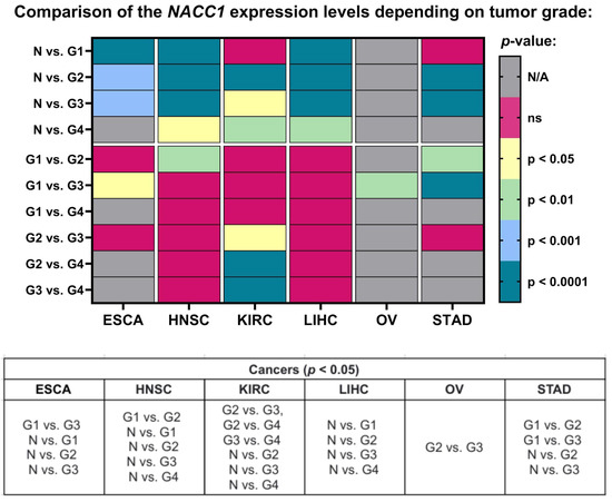 Differences in the expression levels of NACC1 depending on tumor grade in ESCA, HNSC, KIRC, LIHC, OV, and STAD patients based on the TCGA project. Data taken from the UALCAN database. p < 0.05 was considered significant. N, normal; N/A, not analyzed; N/A, not analyzed; ns, no significant; G1, grade 1; G2, grade 2; G3, grade 3; G4, grade 4; ESCA, esophageal carcinoma; HNSC, head and neck squamous cell carcinoma; KIRC, kidney renal clear cell carcinoma; LIHC, liver hepatocellular carcinoma; OV, ovarian serous cystadenocarcinoma; STAD, stomach adenocarcinoma.