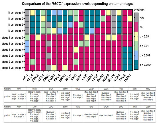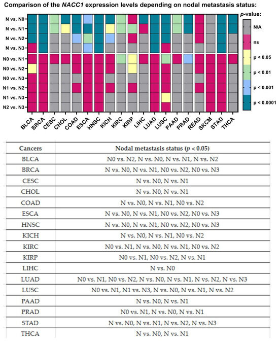 Differences in the expression levels of NACC1 depending on nodal metastasis status in cancers based on the TCGA data. Data taken from the UALCAN database; p < 0.05 was considered significant; N, normal; N/A, not analyzed; ns, no significant; N0, no regional lymph node metastasis; N1, metastases in 1 to 3 axillary lymph nodes; N2, metastases in 4 to 9 axillary lymph nodes; N3, metastases in 10 or more axillary lymph nodes; BLCA, bladder urothelial carcinoma; BRCA, breast invasive carcinoma; CESC, cervical squamous cell carcinoma; CHOL, cholangiocarcinoma; COAD, colon adenocarcinoma; ESCA, esophageal carcinoma; HNSC, head and neck squamous cell carcinoma; KICH, kidney chromophobe; KIRC, kidney renal clear cell carcinoma; KIRP, kidney renal papillary cell carcinoma; LIHC, liver hepatocellular carcinoma; LUAD, lung adenocarcinoma; LUSC, lung squamous cell carcinoma; PAAD, pancreatic adenocarcinoma; PRAD, prostate adenocarcinoma; STAD, stomach adenocarcinoma; THCA, thyroid carcinoma.