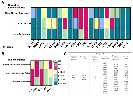 Differences in the expression levels of NACC1 depending on race in the cancers based on the TCGA data: (A) in the group normal vs. tumor samples; (B) only in the group of tumor samples; (C) listed types of tumors in the specified group of comparison. Data taken from the UALCAN database. p < 0.05 was considered significant; N, normal; N/A, not analyzed; ns, no significant; BLCA, bladder urothelial carcinoma; BRCA, breast invasive carcinoma; CESC, cervical squamous cell carcinoma; CHOL, cholangiocarcinoma; COAD, colon adenocarcinoma; ESCA, esophageal carcinoma; GBM, glioblastoma multiforme; HNSC, head and neck squamous cell carcinoma; KICH, kidney chromophobe; KIRC, kidney renal clear cell carcinoma; LIHC, liver hepatocellular carcinoma; LUAD, lung adenocarcinoma; LUSC, lung squamous cell carcinoma; OV, ovarian serous cystadenocarcinoma; PAAD, pancreatic adenocarcinoma; PRAD, prostate adenocarcinoma; STAD, stomach adenocarcinoma; THCA, thyroid carcinoma; UCEC, uterine corpus endometrial carcinoma.