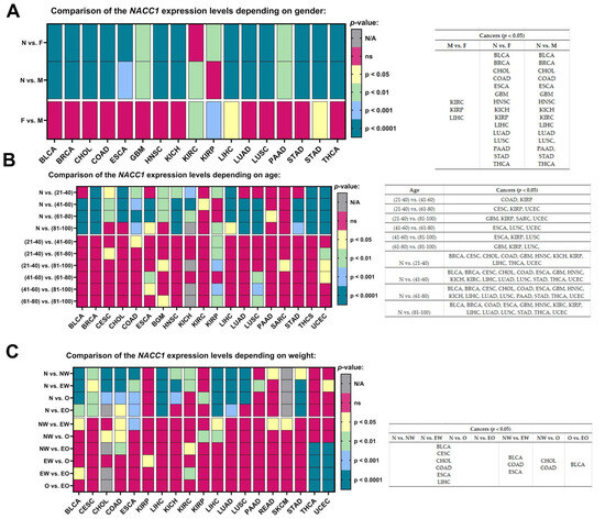 Differences in the expression levels of NACC1 depending on gender (A), age (B), and weight (C) in the cancers based on the TCGA data. Data taken from the UALCAN database. p < 0.05 was considered significant; N, normal; N, N/A, not analyzed; ns, no significant; F, female; M, male; EW, extreme weight: BMI greater than or equal to 25 and less than 30; O, obese: BMI greater than or equal to 30 and less than 40; EO, extreme weight: BMI greater than 40; NW, normal weight: BMI greater than or equal to 18.5 and less than 25; BLCA, bladder urothelial carcinoma; BRCA, breast invasive carcinoma; CESC, cervical squamous cell carcinoma; CHOL, cholangiocarcinoma; COAD, colon adenocarcinoma; ESCA, esophageal carcinoma; GBM, glioblastoma multiforme; HNSC, head and neck squamous cell carcinoma; KICH, kidney chromophobe; KIRC, kidney renal clear cell carcinoma; KIRP, kidney renal papillary cell carcinoma; LIHC, liver hepatocellular carcinoma; LUAD, lung adenocarcinoma; LUSC, lung squamous cell carcinoma; PAAD, pancreatic adenocarcinoma; SARC, sarcoma; STAD, stomach adenocarcinoma; THCA, thyroid carcinoma; UCEC, uterine corpus endometrial carcinoma.