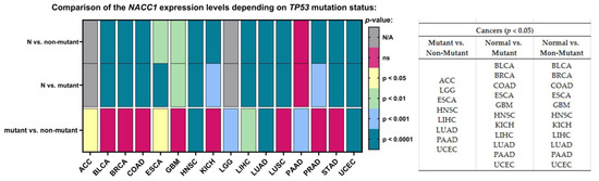 Differences in the expression levels of NACC1 depending on TP-53 mutation status in cancers based on the TCGA data. Data taken from the UALCAN database. A p-value of <0.05 was considered significant; N, normal; N/A, not analyzed; ns, no significant;. ACC, adrenocortical carcinoma; BLCA, bladder urothelial carcinoma; LGG, brain lower-grade glioma; BRCA, breast invasive carcinoma; COAD, colon adenocarcinoma; ESCA, esophageal carcinoma; GBM, glioblastoma multiforme; HNSC, head and neck squamous cell carcinoma; KICH, kidney chromophobe; LICH, liver hepatocellular carcinoma; LUAD, lung adenocarcinoma; PAAD, pancreatic adenocarcinoma; UCEC, uterine corpus endometrial carcinoma.