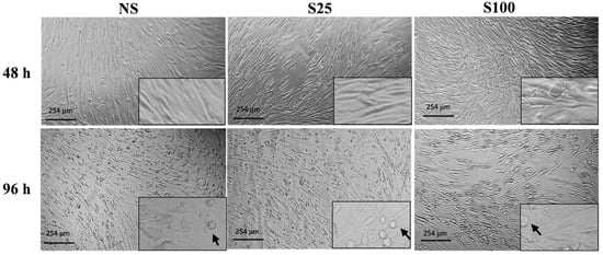 Morphology of adipocytes stimulated with sucralose in the differentiation process. Differentiation process at 48 h and 96 h on preadipocytes stimulated with sucralose. NS (control without sucralose), S25 (25 ng/µL sucralose stimulus), S100 (100 ng/µL sucralose stimulus). The black arrows in the box represent normal adipocyte morphology.