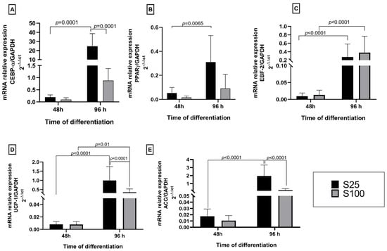 Additionally, the expression results for the marker genes differentiate brown adipocytes EBF-2 and the uncoupling protein UCP-1, showing that there is an increase in the expression of EBF-2 and UCP-1 at 96 h with significance between both differentiation times (p < 0.0001). However, these brown adipocyte markers’ increased expression levels are not similar to our values obtained for CEBP-α. Our results show that the concentration S25 favored the increase in the expression of EBP-2 and UCP-1 at 96 h of the adipocyte differentiation process (Figure 2C,D).
