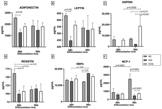 We quantified five adipokines (adiponectin, leptin, adipsin, resistin, and RBP4) and MCP-1 chemokine at 48 h (early differentiation) and 96 h (complete differentiation) under the stimulus of sucralose 25 and 100 ng/µL (S25 and S100) and the control without sucralose (NS).