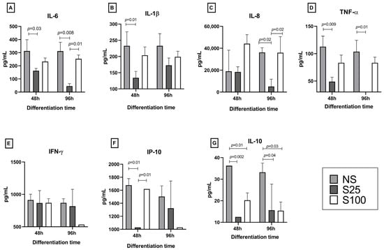 For IL-1β, all the stimuli have similar concentrations of around 200 pg/mL without statistical differences, except for S25 at early differentiation (48 h), which reduces the concentration respect NS by 42% (134.2 and 232.7 pg/mL, respectively, p = 0.001) (Figure 4B).