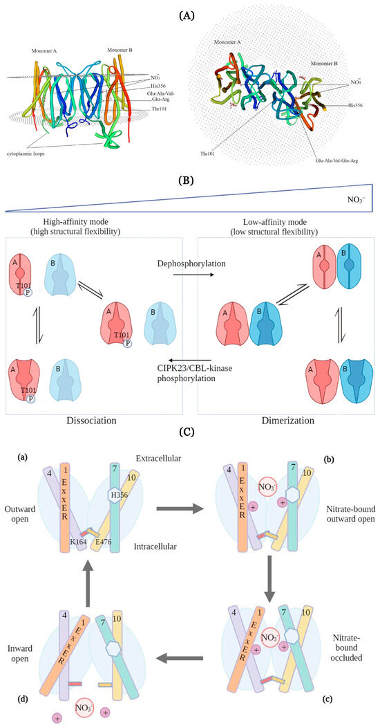 | Arabidopsis thaliana | AtNPF6.3 (NRT1.1/CHL1.1), AT1G12110, plasma membrane | B | Thr101/His356/Thr360/Phe511 THTF | Dual-affinity nitrate transporter, auxin transport, nitrate signaling, chloride transport in the absence of nitrate | [4,24,45,50] |