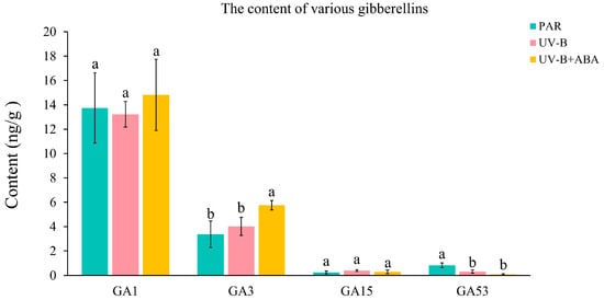 This implies that exogenous ABA may have an impact on R. chrysanthum’s GAs content under UV-B. Furthermore, exogenous ABA therapy causes considerable alteration in the contents of GA3 and GA53, which is probably the main influencing factor. Thus, ABA and GAs of R. chrysanthum are able to interact and function together in response to UV-B stress.