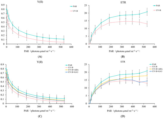 Figure 2A,B). On this basis, the Y(II) and ETR curves of the experimental materials treated with two exogenous hormones (ABA and GA3) were intermediate between PAR and UV-B treatments. This indicates that ABA and GA3 have a protective effect on the photosynthetic system of
