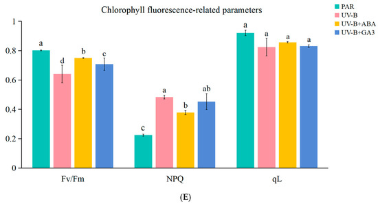 The bar graph data showed that Fv/Fm (Maximal photochemical efficiency of PSII) decreased significantly after UV-B radiation compared to the PAR-treated group. The exogenous hormones (ABA and GA3) alleviated this trend, and Fv/Fm increased significantly. qL (photochemical quenching) and Fv/Fm showed similar trends, but these differences were not significant. The significant increase in NPQ (non-photochemical quenching) after UV-B radiation suggests that the photosynthetic system of