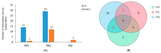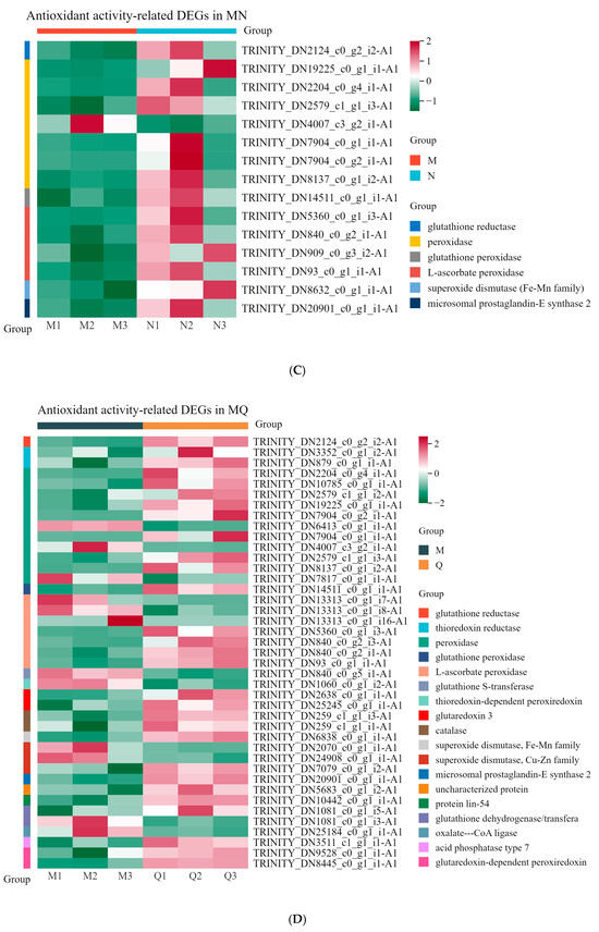 The results of GO analysis showed that there were 15 antioxidant activity-related differentially expressed genes (DEGs) (14 upregulated and 1 downregulated) in MN (MvsN), 41 antioxidant activity-related DEGs (29 upregulated and 12 downregulated) in MQ (MvsQ), and 2 antioxidant activity-associated DEGs in NQ (NvsQ) (2 downregulated) (
