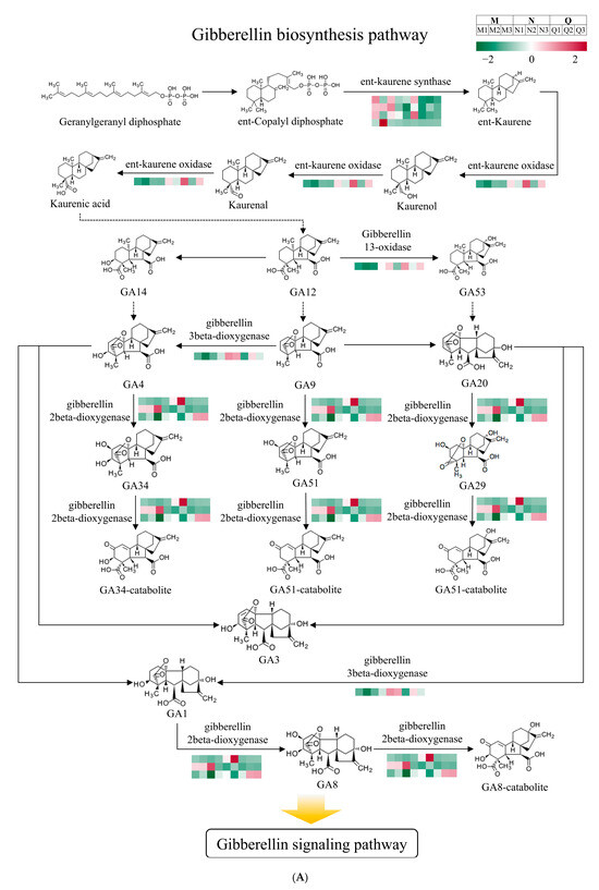Figure 4A). Notably, DEGs in the pathways involved in GA3 biosynthesis were expressed higher in both groups N and Q than in group M (except for ent-kaurene synthase) (