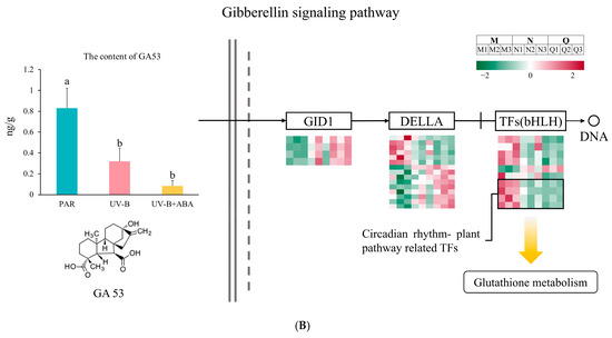 Figure 1). And in the GA53 biosynthesis pathway, UV-B and exogenous ABA caused the significant upregulation of DEG of Gibberellin 13-oxidase. Gibberellin 13-oxidase regulates GA activity and regulates plants by inhibiting GA activity [