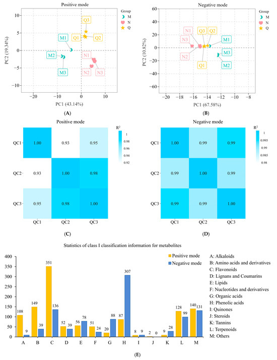Figure 5A,B). The high correlation between the quality control samples (QC) indicated that UPLC-MS/MS (ultra-performance liquid chromatography–tandem mass spectrometry) was highly stable (