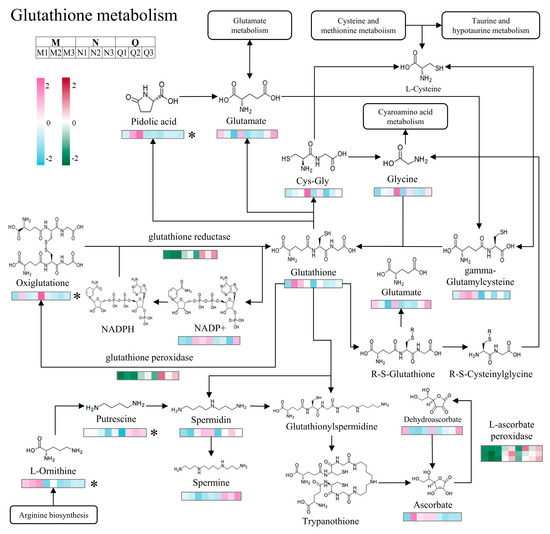 37]. Glutathione metabolism not only protects plants from adversity, but also participates in the process of adaptation to environmental changes involving multiple reactive oxygen species scavenging and response to adversity stress. Glutathione reductase can help maintain the reduced state of glutathione. Reduced glutathione (GSH) is one of the most important antioxidants in the cell, scavenging free radicals and reactive oxygen species (ROS) to protect cells from oxidative damage [