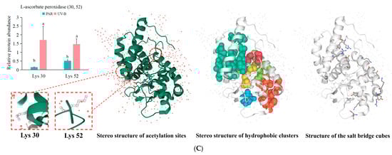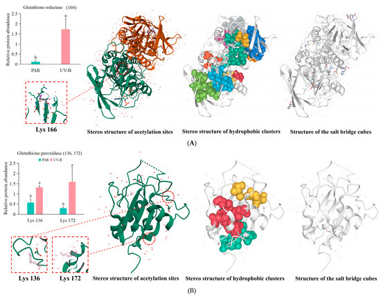 Figure 8B,C). And all these acetylation modifications were significantly upregulated after UV-B. Similar to glutathione reductase, non-covalent interactions like hydrophobic clusters and salt bridges are also present for glutathione peroxidase and L-ascorbate peroxidase (