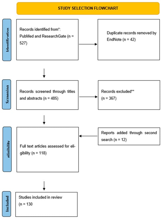 Flowchart of search strategy. * Due to frequent gaps in the PubMed database regarding selected molecular aspects, we included older studies if, after consultation between three authors, the study was deemed crucial (three authors indicated “yes” during the inclusion voting (“yes” or “no”). Additionally, we used ResearchGate for topics that were not sufficiently covered by data exclusively from PubMed. ** In this step, despite excluding studies that did not meet our inclusion criteria, we removed duplicate studies missed by the automated tool.