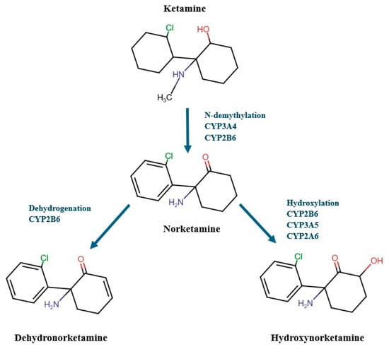 Ketamine (both isomers) is primarily metabolized through N-demethylation by a microsomal enzyme system (hepatic biotransformation through the cytochrome P450 (CYP), primarily by isoenzymes 3A4 and 2B6), resulting in the formation of norketamine (Figure 2), which accounts for about 80% of the metabolites. Additional minor pathways, such as hydroxylation of the cyclohexanone ring of ketamine and norketamine, have been identified. Norketamine is then mainly converted by CYP2B6, CYP3A5, and CYP2A6 through hydroxylation to hydroxynorketamine (HNK) and by CYP2B6 through dehydrogenation to dehydronorketamine (DHNK) (Figure 2), which are eventually excreted in bile and urine following glucuronidation. Glucuronidation is primarily catalyzed by uridine-5′-diphospho-glucuronosyl-transferases (UGTs). Moreover, besides CYP2B6 and CYP3A4, CYP2C19 and CYP2D6 also play essential roles in ketamine metabolism, while CYP2C9’s involvement is considered insignificant [67,71,72,73,74].