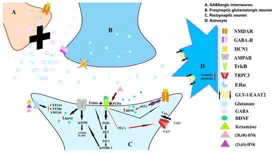 Ketamine blocks NMDA receptors on GABA-releasing interneurons (A), reducing GABA release from presynaptic glutamatergic neuron (B). Reduction in HCN1 activity promotes increased glutamate release. Glutamate activates AMPA receptors at a postsynaptic neuron (C), which initiates a cascade of intracellular events involving the mTOR pathway, elevating BDNF levels. The activation of mTOR is linked to increased phosphorylation of the proteins 4E-BP1 and p70S6K. Elevated BDNF levels activate TrkB receptors, activating TRPC3 through the TrkB-PLCγ pathway. Additionally, BDNF indirectly triggers rapid activation of the PI3K-Akt pathway, stabilizing the interaction between PSD-95 and TrkB to facilitate synaptic connectivity. TrkB modulates NMDA receptor activity by dissociating RasGrf1 from NR2B, reducing NMDA receptor signaling associated with LTD. Blockade of NMDA receptors also reduces phosphorylation of eEF2, which, in turn, enhances BDNF expression. Akt activation further influences cellular processes by inhibiting the TSC2 protein, releasing mTORC1 from regulatory constraints, and enhancing mTORC1 signaling. (2R,6R)-HNK dissociates TrkB from PTPσ, restoring juvenile-like plasticity in the brain. Additionally, ketamine administration restores GLT-1 levels in astrocytes (D), supporting glutamate reuptake and regulation. Activation of the ERα receptor initiates a positive feedback loop in which ketamine enhances the effects of its metabolites by increasing the activity of the enzymes CYP2A6 and CYP2B6.