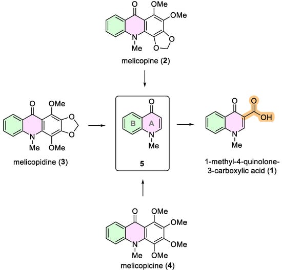 Degradation reaction of the alkaloids melicopine (2), melicopidine (3), and melicopicine (4), resulting in the formation of 1-methyl-4-quinolone (5). The corresponding acid, 1-methyl-4-quinolone-3-carboxylic acid (1), represents the first compound in the quinolone group (Adapted from Crow and Price, 1949 [14]).