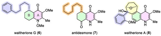 Examples of 4-quinolone alkaloids: phenyl-terminal open chain (waltherione G (6)), methyl-terminal open chain (antidesmone (7)), and cyclized (waltherione A (8)).
