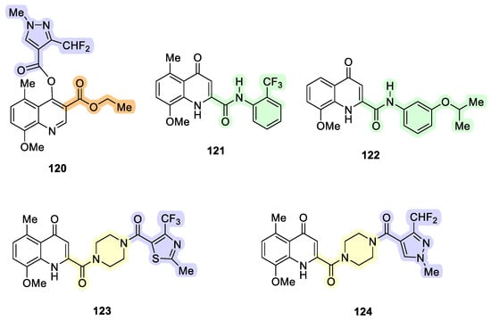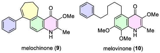 Finally, the synthetic strategy developed by Kaufman and Larghi’s group allowed for obtaining the natural quinolin-4(1H)-ones waltherione F (44) and melovinone (10). These compounds were synthesized through synthetic routes consisting of seven steps with an overall yield of 31%, and 11 steps with an overall yield of 18%, respectively [51,56].