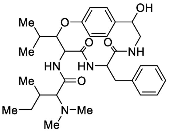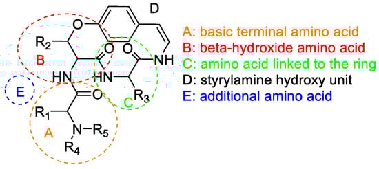 Cyclopeptide alkaloids are a group of polyamide bases composed of four structural units: A, B, C, and D. Unit A is an N-mono or dimethylated basic terminal amino acid; unit B is a β-hydroxy amino acid (3-hydroxyproline, 3-hydroxyleucine, or 3-hydroxyphenylserine); the C unit is a ring-bound amino acid; the D unit is a p- or m-hydroxy styryl amine derived from tyrosine, forming an α-amino acid fragment. Occasionally, an additional unit, E, may be present between units A and B, consisting of an intermediate amino acid (Figure 4) [33,34,35,36,37].
