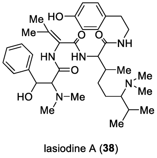 Despite this understanding, knowledge about the biosynthetic pathway of cyclopeptide alkaloids in plants is limited. However, investigations using likely intermediaries have allowed researchers to propose some main routes. One such route was elucidated through the isolation of linear cyclopeptide alkaloids, such as lasiodine A (38), which features a free phenolic group and a dihydroamino acid unit (Figure 6) [46].