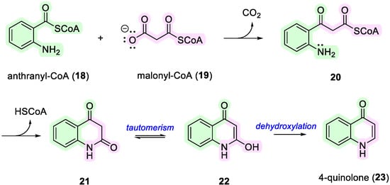 Dewick proposes that the quinolone nucleus forms from anthranilic acid through a series of reactions. Initially, a Claisen condensation initially occurs between anthranyl-CoA (18) and malonyl-CoA (19). This reaction is driven by the decarboxylation of the malonyl unit, which then undergoes nucleophilic attack by the CH2 anion of the malonyl-CoA unit on the thioester carbonyl of anthranyl-CoA. Subsequently, the nitrogen electron pair attacks the carbonyl, releasing an HS-CoA unit. This is followed by tautomerism and dehydroxylation (Scheme 1) [43].