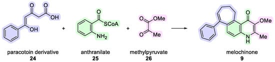Kapadia et al. noted that the 4-quinolone alkaloid melochinone (9) has an unusual structure, featuring a seven-membered ring fused to an aromatic ring. This was the first report of a quinolin-4-one nucleus with a methyl group at position 2 and a methoxyl group at position 3. The authors considered the presence of the seven-membered ring as a biosynthetic puzzle, a problem in biosynthetic terms, suggesting a possible condensation of paracotoin (24) with anthranilate (25). The presence of methoxyl at position 3 and methyl at position 2 was suggested from the condensation of the anthranilate unit with methyl pyruvate (26) (Scheme 2) [17]. However, this proposal lost its meaning after the publication of the biosynthesis of antidesmone (7) by Bringmann and collaborators [19].