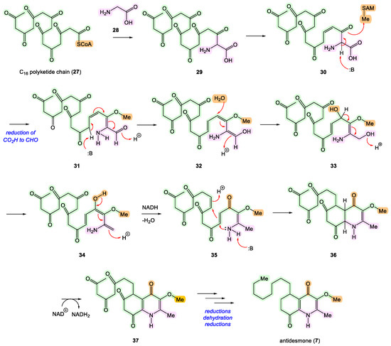 Bringmann and collaborators found the biosynthesis of antidesmone (7) to be unusual, prompting them to conduct a study via isotopic labeling with cultures of Antidesma membranaceum cells (Phyllanthaceae/Euphorbiaceae). Through the incorporation of precursors labeled with 13C (glucose and acetate) and 15N (glycine and aspartate), and nuclear magnetic resonance (NMR) analysis, they concluded that antidesmone (7) was biosynthesized from a C16 polyketide chain (27) and glycine (28). They also suggested an alternative biosynthetic route. The methyl at carbon 2 of the 4-quinolone system originates from the amino acid glycine (28), while for the methoxy at carbon 3 derives its oxygen from the acetate pathway and the methyl from S-adenosylmethionine (SAM). The authors proposed that antidesmone (7) and melochinone (9) might share a common precursor (Scheme 3) [19].